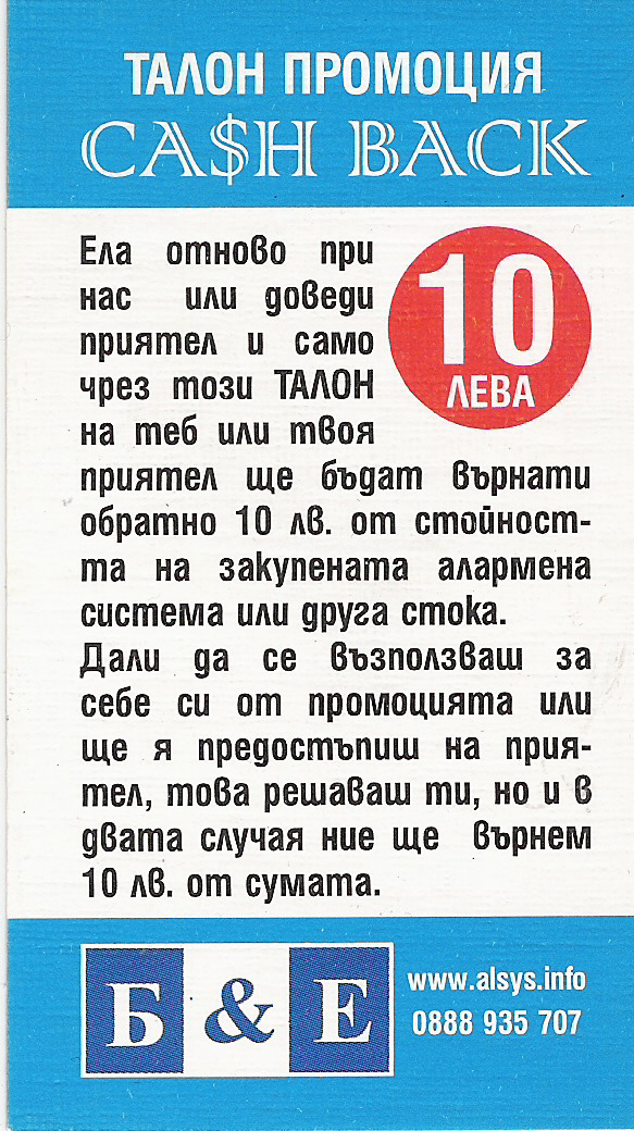 Уважаеми клиенти сега Ви предлагаме нашата нова програма ,създадена специално за Вас ! При закупуване и поставяне на автоаларма в нашия сервиз ние ще Ви дадем един специален ТАЛОН чрез който при монтиране на следваща алармена система , Вие ще си върнете 10 лв. от заплатената сума. Можете също така да дадете талона на някой Ваш близък или приятел като подарък и така той да се възползва от възможността да плати с 10 лв. по-малко от стойността на неговата автоаларма, ксенон комплект, парктроник, радар-детектор, авто-CD плеър или друга стока, закупена от нас. Изборът за това дали Вие ще се възползвате или ще го предостъпите е Ваш, бонусът е наш :))